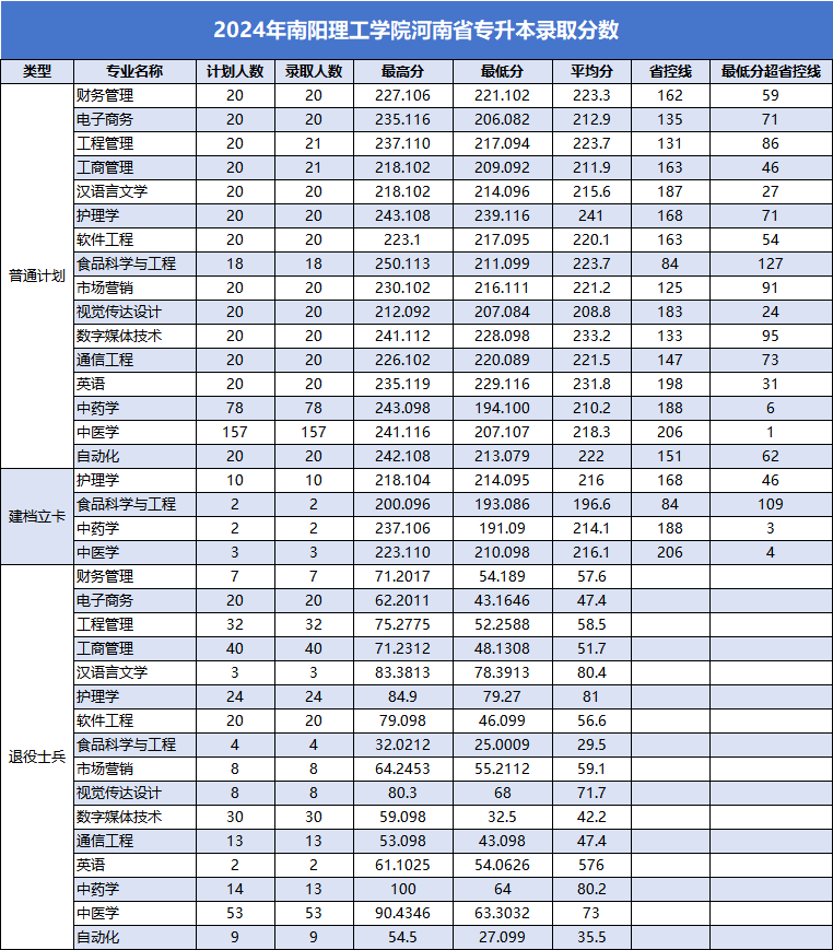 2024年河南专升本选拔考试录取分数线已经公布。南阳理工学院各专业大类录取分数线已公布,例如:普通计划财务管理平均分223.3分,电子商务平均分212.9分,工程管理平均分223.7,具体信息如下。