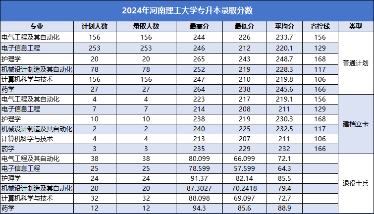 2024年河南专升本选拔考试录取分数线已经公布。河南理工大学各专业大类录取分数线已公布,例如:普通计划电气工程及其自动化平均分233.7分,电子信息工程平均分129分,具体信息如下。