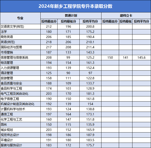 2024年河南专升本选拔考试录取分数线已经公布。新乡工程学院各专业大类录取分数线已公布,例如,汉语言文学(师范)投档平均分200.8分、法学投档平均分175.2分,具体信息如下。